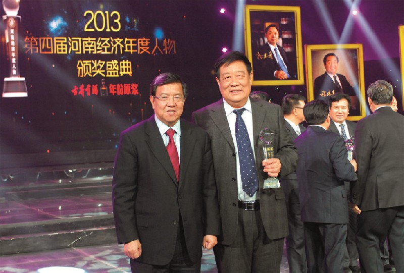 MR. LONG YONGTU PRESENTS THE AWARD FOR THE 4TH ANNUAL PEOPLE OF ECONOMY MADE KNOWN TO MR. LI YUTIAN, THE CHAIRMAN OF HENAN JIYUAN IRON &STEEL COMPANY -