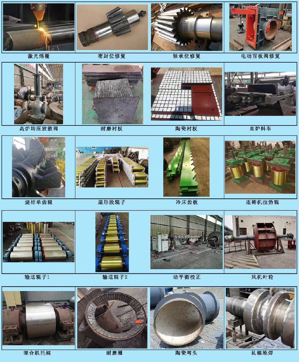 公司致力于硬质耐磨材料的技术开发及应用、激光熔覆修复、中速磨磨辊、单齿辊破碎机转子、篦板、四辊辊子、连铸辊和耐磨输送辊的加工和修复,轧辊修复、各类阀门修复、旋转设备平衡实验、耐磨合金板及陶瓷衬板等的制作与安装、机械设备检修服务。